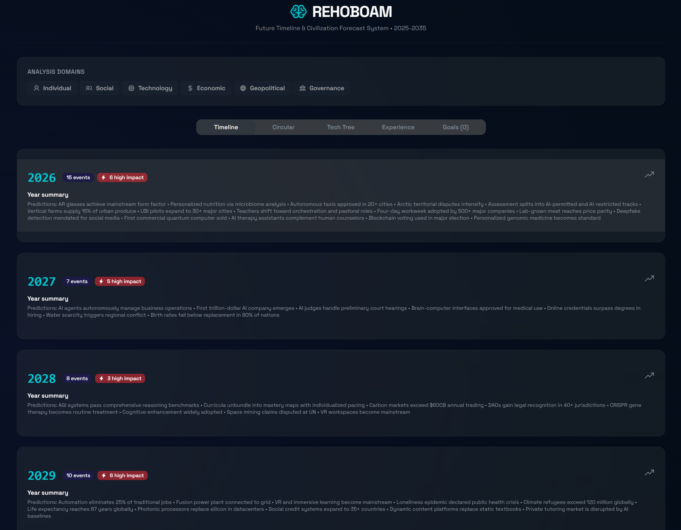 Rehoboam aims to be the closest thing to a future timeline simulator, where prediction market data, real-time events including news updates, social feeds, technology announcements, economic policies and results, geopolitical and governance upheavals stream into our AI forecast system to help you align your near term goals in preparation for a post-AGI world and get ready for the emergence of superintelligence.